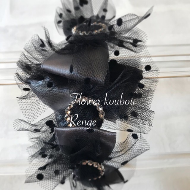 サテンリボンとチュールレースを組み合わせたボリュームのあるカチューシャです。バックルをリボンの中央にあしらいました。プラスチックバックルですので軽くてずれにくいです。
